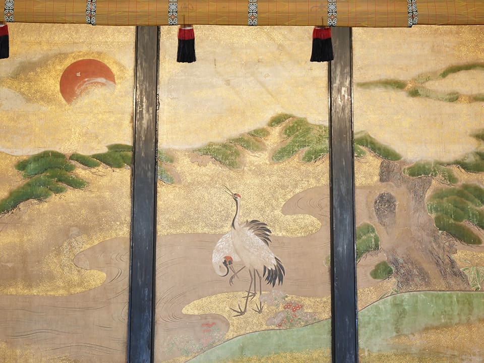 内部は三列に並ぶ五室ずつの座敷で構成され、中央列奥の上々段の間には、津藩御用絵師・紀宗浄による、大きな松と丹頂鶴の壁画が描かれています。