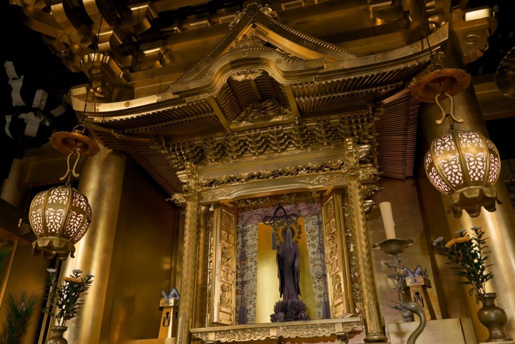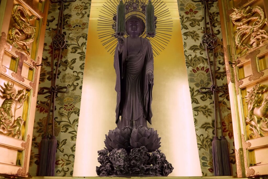 Diese stehende Statue von Buddha Amida ist das Hauptbild des Senjuji-Tempels. Es wurde entweder von Kaikei (1150–1250) oder einem seiner Schützlinge geschaffen. Nach einer siebentägigen Predigt auf dem Berg Hiei überreichte der Enryakuji-Tempel Shinne Shōnin das Bild als Anerkennung der Legitimität der Takada-Sekte. Das Bild symbolisiert bis heute die Legitimität der Lehre und der religiösen Sekte des Senjuji-Tempels.