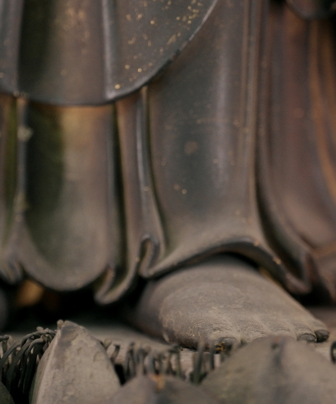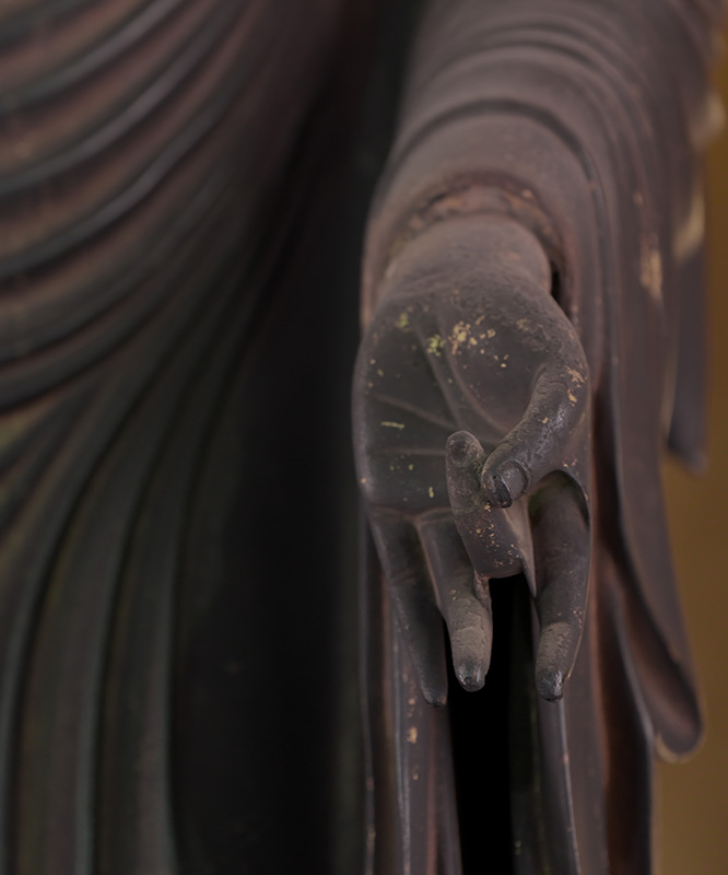 Diese Statue zeigt viele typische Stilelemente von Kaikei, einem Künstler der Kei-Schule buddhistischer Bildhauerei. Sie stammt vermutlich aus dem späten 13. Jahrhundert. Die Figur lehnt sich leicht nach vorne, der linke Fuß tritt nach außen und das Gewand ist sorgfältig mit eingelegten Kirikane-Mustern verziert. Keine Zapfen verbinden die Füße mit der Basis; stattdessen zieren zinnoberrote buddhistische Motive die Sohlen. Die Statue wird von einer Kupferstange getragen, die durch den lotusförmigen Sockel verläuft. Jedes Detail wurde sorgfältig ausgearbeitet, einschließlich des feinen Metalls der Finger- und Fußnägel.
