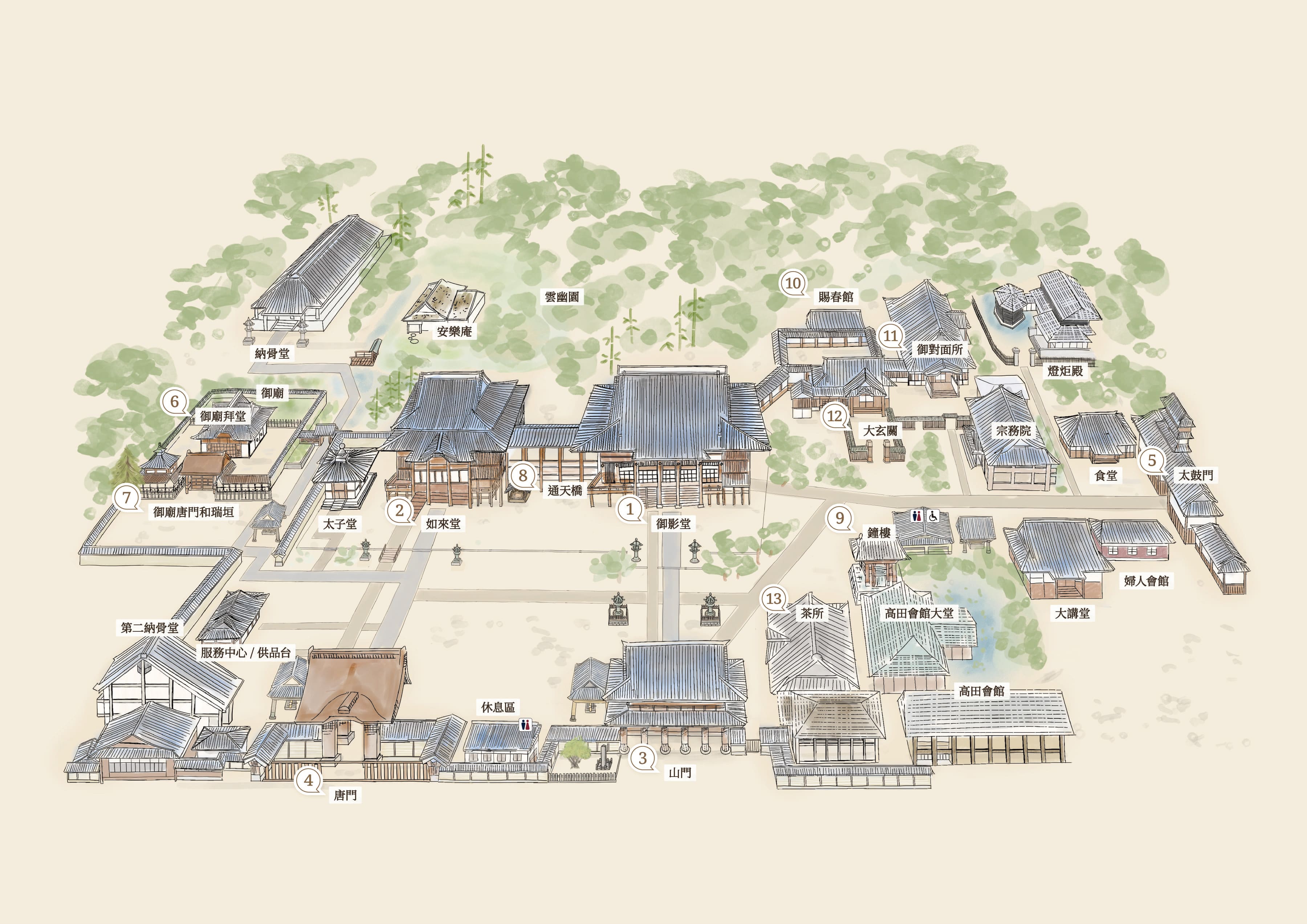 境內圖 一望 專修寺的世界 寺院境內的地圖可放大或縮小 ① 御影堂 ② 如來堂 ③ 山門 ④ 唐門 ⑤ 太鼓門 ⑥ 御廟 ⑦ 御廟唐門和瑞垣 ⑧ 通天橋 ⑨ 鐘樓 ⑩ 賜春館 ⑪ 御對面所 ⑫ 大玄關 ⑬ 茶所 了解文化財產 收聽語音導覽 觀看影片導覽 虛擬實境體驗 閱覽寺院境內圖